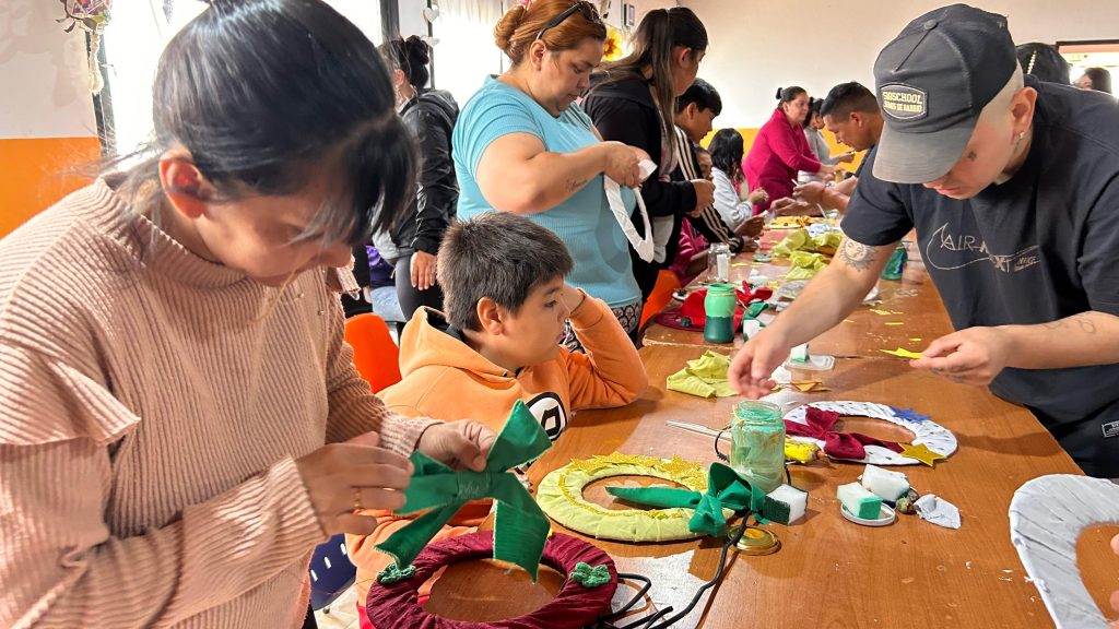 En el Centro Integrador Comunitario (CIC) del barrio Centenario, las talleristas enseñaron a las asistentes a realizar adornos navideños como centros de mesa y roscas ornamentadas para colgar.A lo largo de todo el año, se implementó esta modalidad conjunta con talleres, capacitaciones, acompañamiento en salud y asistencia alimentaria.