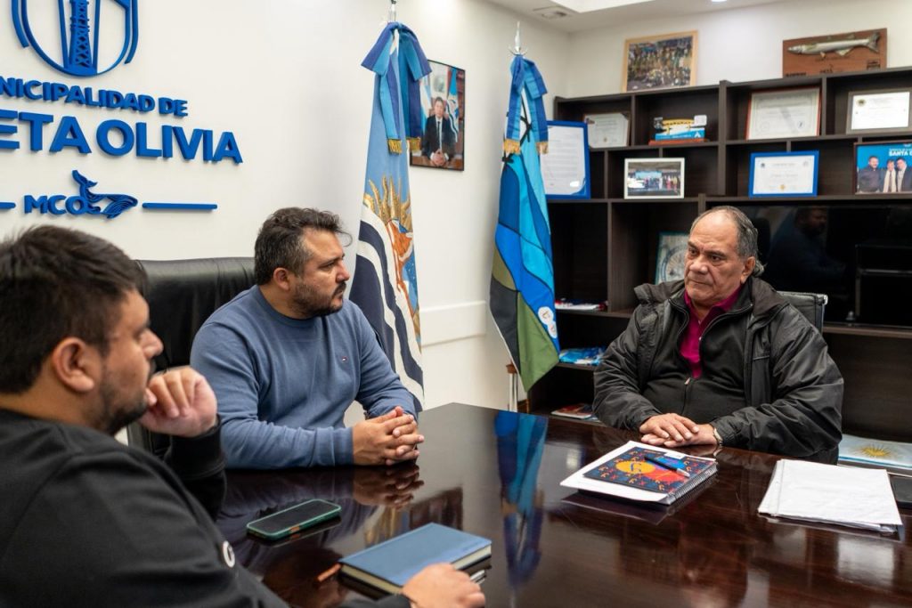 El intendente municipal Pablo Carrizo, junto al secretario de Hacienda, Franco Antipani, mantuvo una reunión de trabajo con el secretario general del Sindicato de Obreros y Empleados Municipales de Caleta Olivia (SOEMCO) Julián Carrizo, en el marco de las negociaciones que se vienen desarrollando con el gremio.
