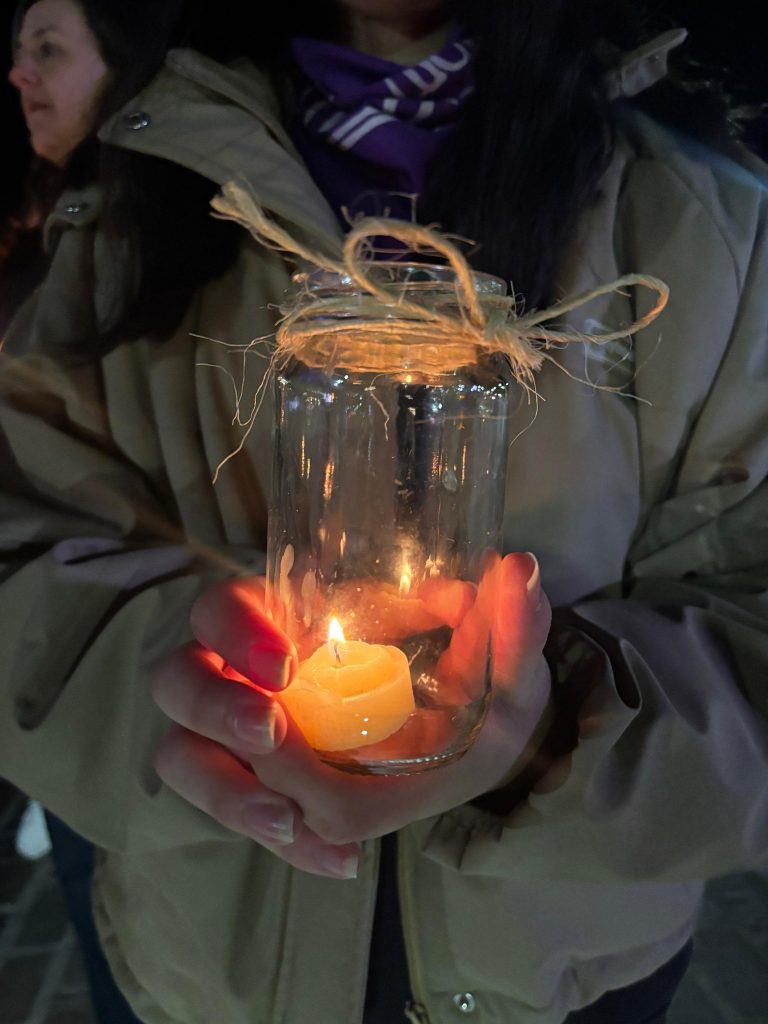 Luego de las expresiones artísticas, se realizó el encendido de velas que portaron los participantes para caminar alrededor del Gorosito. El monumento se iluminó de color violeta, que simboliza la lucha contra la violencia por cuestiones de género.